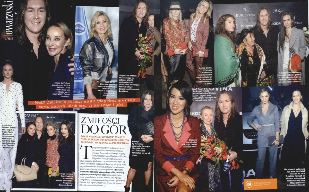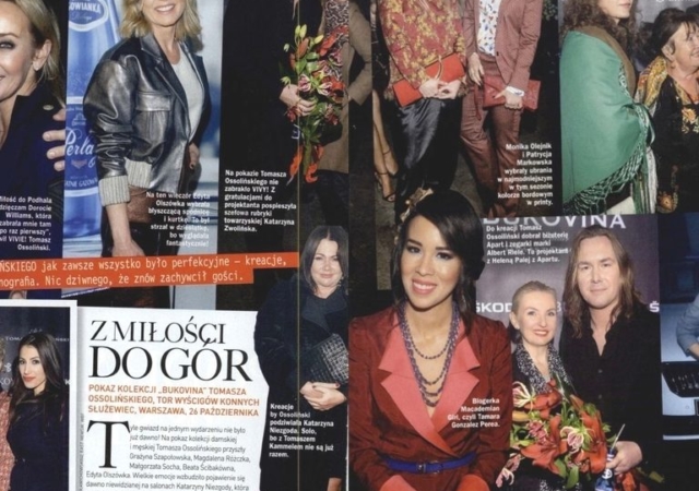Projektując swoją nową kolekcję Tomasz Ossoliński czerpał inspiracje z piękna podhalańskiej przyrody i bogactwa kultury tego regionu. Sponsorem tytularnym i głównym partnerem pokazu był Hotel Bukovina. Zespół naszej agencji brał udział w przygotowaniu pokazu i koordynował współpracę projektanta z marką Bukovina. Nasza agencja przygotowała także i przeprowadziła akcję public relations dla tego projektu. Pokaz obejrzały tłumy gości zainteresowanych modą, przedstawiciele mediów oraz wiele sympatyzujących z projektantem gwiazd. Scenografia pokazu nawiązywała do podhalańskich krajobrazów oraz motywów kultury góralskiej, którą Tomasz Ossoliński od lat jest zafascynowany. Pokazowi towarzyszyła specjalna prezentacja zdjęć Podhala, której autorem jest wybitny fotograf związany z tym regionem – Tomasz Tomaszewski. Great Story / Cappuccino PR prowadzi kompleksową obsługę PR marki Bukovina.